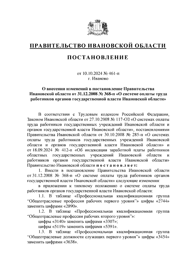 Постановление Правительства Ивановской области от 10.10.2024 N 461-п "О внесении изменений в постановление Правительства Ивановской области от 31.12.2008 N 368-п "О системе оплаты труда работников органов государственной власти Ивановской области"