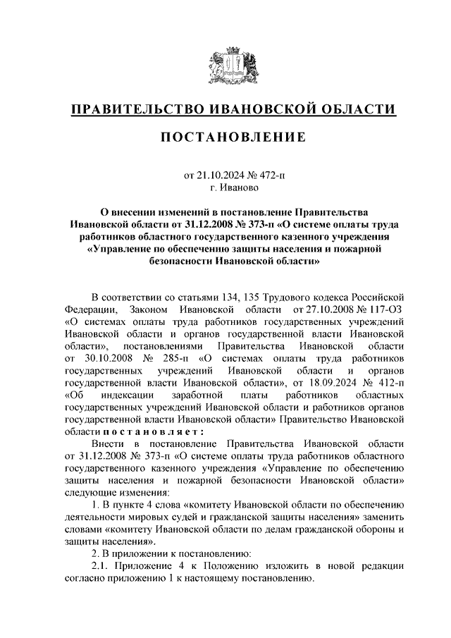 Постановление Правительства Ивановской области от 21.10.2024 N 472-п "О внесении изменений в постановление Правительства Ивановской области от 31.12.2008 N 373-п "О системе оплаты труда работников областного государственного казенного учреждения "Управление по обеспечению защиты населения и пожарной безопасности Ивановской области"