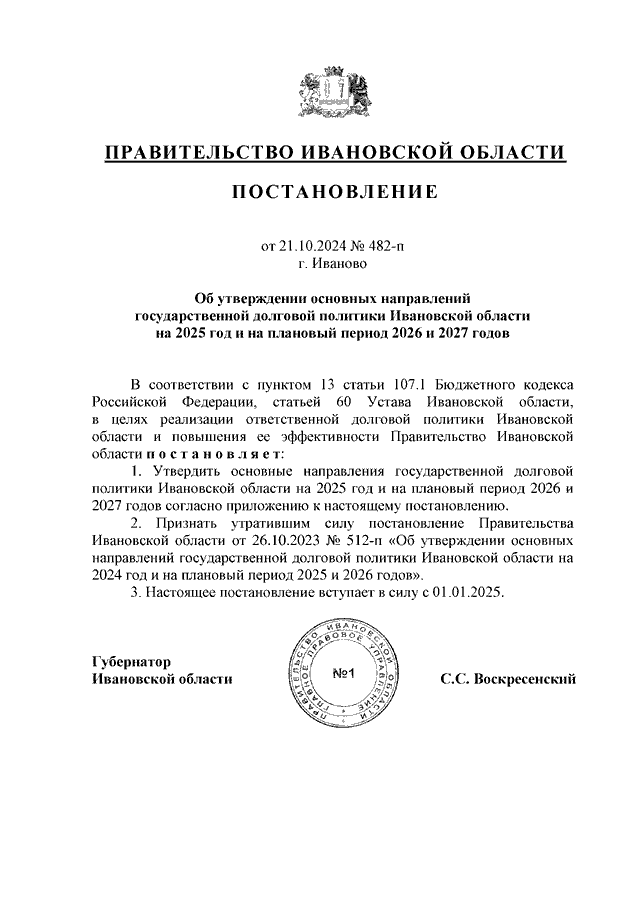 Постановление Правительства Ивановской области от 21.10.2024 N 482-п "Об утверждении основных направлений государственной долговой политики Ивановской области на 2025 год и на плановый период 2026 и 2027 годов"