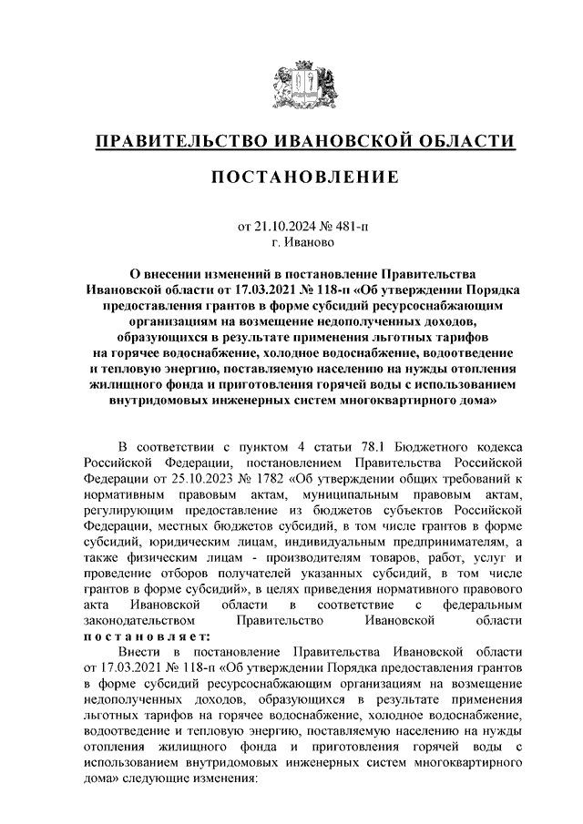 Постановление Правительства Ивановской области от 21.10.2024 N 481-п "О внесении изменений в постановление Правительства Ивановской области от 17.03.2021 N 118-п "Об утверждении Порядка предоставления грантов в форме субсидий ресурсоснабжающим организациям на возмещение недополученных доходов, образующихся в результате применения льготных тарифов на горячее водоснабжение, холодное водоснабжение, водоотведение и тепловую энергию, поставляемую населению на нужды отопления жилищного фонда и приготовления горячей воды с использованием внутридомовых инженерных систем многоквартирного дома"