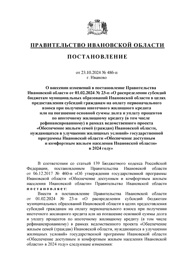 Постановление Правительства Ивановской области от 23.10.2024 N 486-п "О внесении изменений в постановление Правительства Ивановской области от 01.02.2024 N 23-п "О распределении субсидий бюджетам муниципальных образований Ивановской области в целях предоставления субсидий гражданам на оплату первоначального взноса при получении ипотечного жилищного кредита или на погашение основной суммы долга и уплату процентов по ипотечному жилищному кредиту (в том числе рефинансированному) в рамках ведомственного проекта "Обеспечение жильем семей (граждан) Ивановской области, нуждающихся в улучшении жилищных условий" государственной программы Ивановской области "Обеспечение доступным и комфортным жильем населения Ивановской области" в 2024 году"