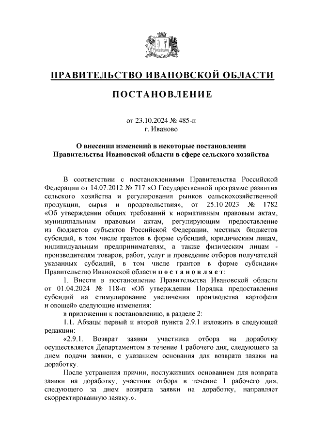 Постановление Правительства Ивановской области от 23.10.2024 N 485-п "О внесении изменений в некоторые постановления Правительства Ивановской области в сфере сельского хозяйства"