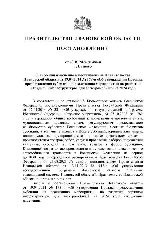 Постановление Правительства Ивановской области от 23.10.2024 N 484-п "О внесении изменений в постановление Правительства Ивановской области от 19.04.2024 N 178-п "Об утверждении Порядка предоставления субсидий на реализацию мероприятий по развитию зарядной инфраструктуры для электромобилей на 2024 год"