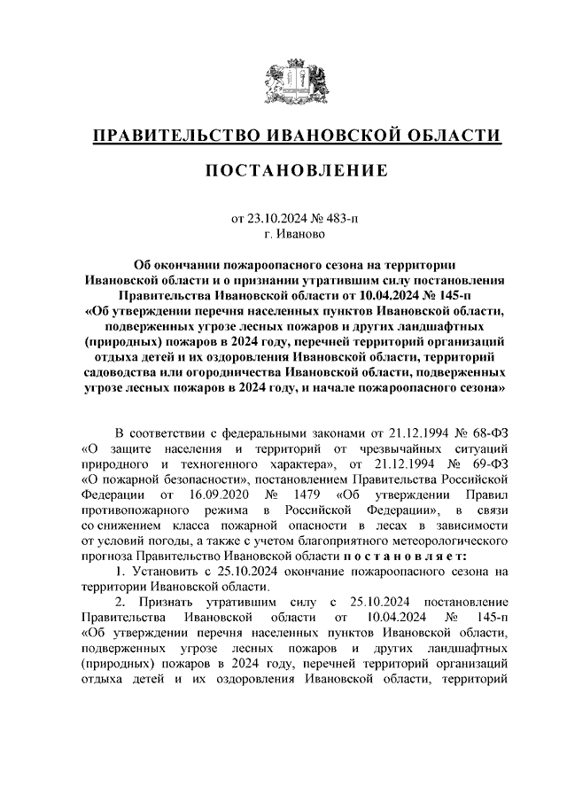 Постановление Правительства Ивановской области от 23.10.2024 N 483-п "Об окончании пожароопасного сезона на территории Ивановской области и о признании утратившим силу постановления Правительства Ивановской области от 10.04.2024 N 145-п "Об утверждении перечня населенных пунктов Ивановской области, подверженных угрозе лесных пожаров и других ландшафтных (природных) пожаров в 2024 году, перечней территорий организаций отдыха детей и их оздоровления Ивановской области, территорий садоводства или огородничества Ивановской области, подверженных угрозе лесных пожаров в 2024 году, и начале пожароопасного сезона"