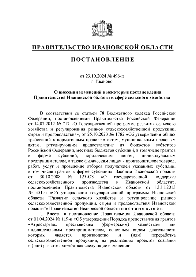 Постановление Правительства Ивановской области от 23.10.2024 N 496-п "О внесении изменений в некоторые постановления Правительства Ивановской области в сфере сельского хозяйства"