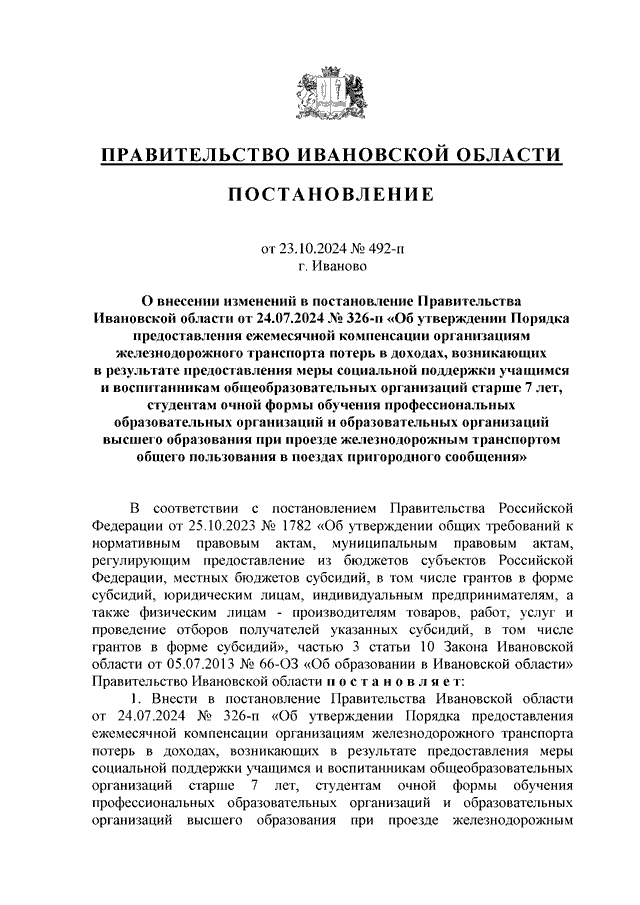Постановление Правительства Ивановской области от 23.10.2024 N 492-п "О внесении изменений в постановление Правительства Ивановской области от 24.07.2024 N 326-п "Об утверждении Порядка предоставления ежемесячной компенсации организациям железнодорожного транспорта потерь в доходах, возникающих в результате предоставления меры социальной поддержки учащимся и воспитанникам общеобразовательных организаций старше 7 лет, студентам очной формы обучения профессиональных образовательных организаций и образовательных организаций высшего образования при проезде железнодорожным транспортом общего пользования в поездах пригородного сообщения"
