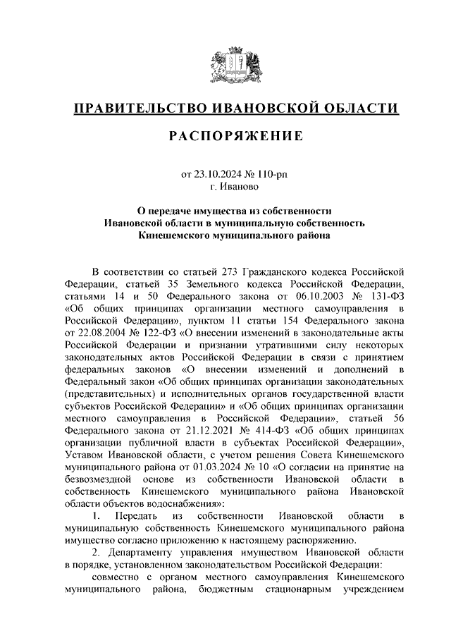 Распоряжение Правительства Ивановской области от 23.10.2024 N 110-рп "О передаче имущества из собственности Ивановской области в муниципальную собственность Кинешемского муниципального района"