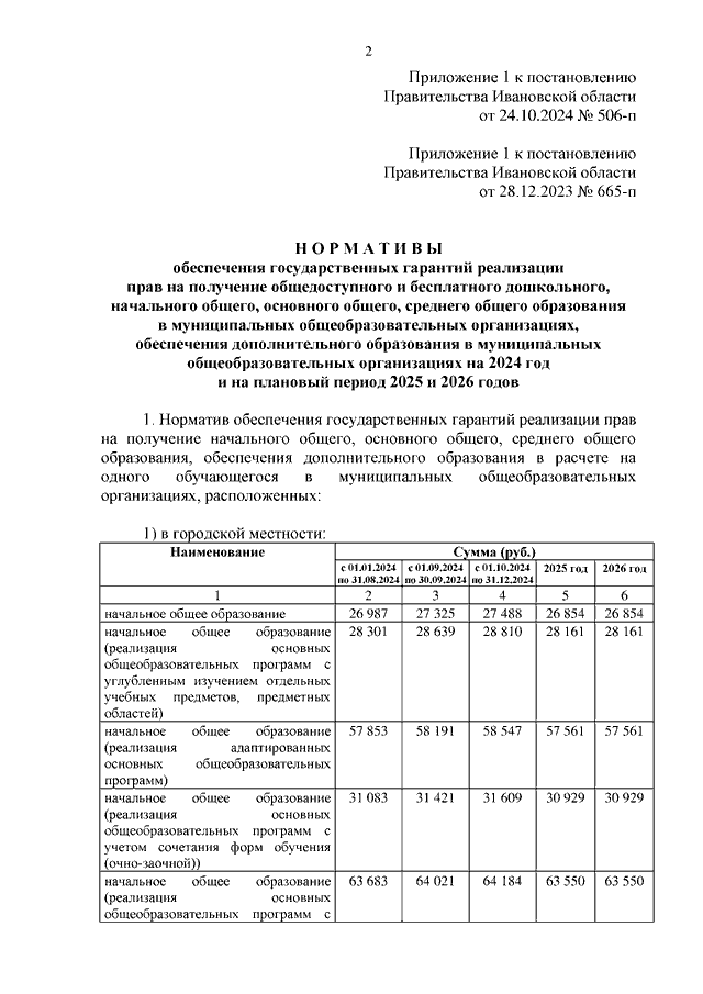 Постановление Правительства Ивановской области от 24.10.2024 N 506-п "О внесении изменений в постановление Правительства Ивановской области от 28.12.2023 N 665-п "Об утверждении нормативов обеспечения государственных гарантий реализации прав на получение общедоступного и бесплатного общего образования, обеспечения дополнительного образования в муниципальных образовательных организациях и возмещения затрат на финансовое обеспечение получения общего образования в частных образовательных организациях на 2024 год и на плановый период 2025 и 2026 годов" (вместе с "Нормативами обеспечения государственных гарантий реализации прав на получение общедоступного и бесплатного дошкольного, начального общего, основного общего, среднего общего образования в муниципальных общеобразовательных организациях, обеспечения дополнительного образования в муниципальных общеобразовательных организациях на 2024 год и на плановый период 2025 и 2026 годов", "Нормативами возмещения затрат на финансовое обеспечение получения дошкольного, начального общего, основного общего, среднего общего образования в частных общеобразовательных организациях, осуществляющих образовательную деятельность по имеющим государственную аккредитацию основным общеобразовательным программам, на 2024 год и на плановый период 2025 и 2026 годов", "Нормативами обеспечения государственных гарантий реализации прав на получение общедоступного и бесплатного дошкольного образования в муниципальных дошкольных образовательных организациях на 2024 год и на плановый период 2025 и 2026 годов", "Нормативами возмещения затрат на финансовое обеспечение получения дошкольного образования в частных дошкольных образовательных организациях на 2024 год и на плановый период 2025 и 2026 годов")