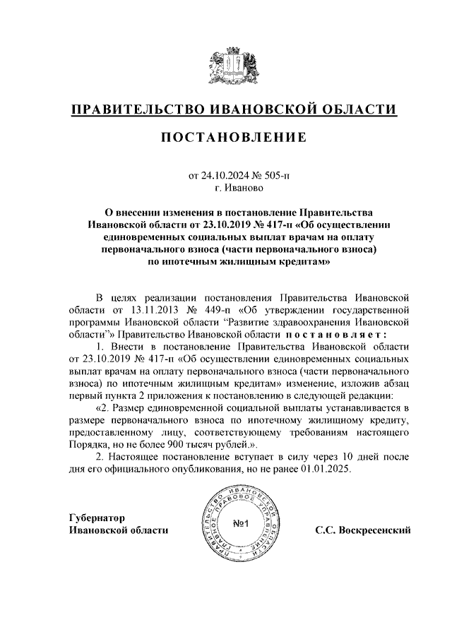 Постановление Правительства Ивановской области от 24.10.2024 N 505-п "О внесении изменения в постановление Правительства Ивановской области от 23.10.2019 N 417-п "Об осуществлении единовременных социальных выплат врачам на оплату первоначального взноса (части первоначального взноса) по ипотечным жилищным кредитам"