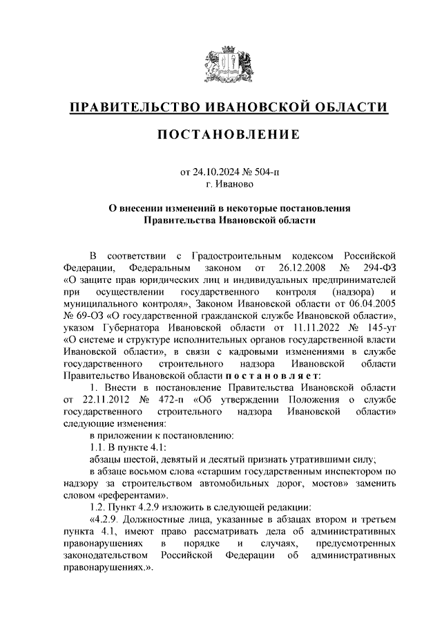 Постановление Правительства Ивановской области от 24.10.2024 N 504-п "О внесении изменений в некоторые постановления Правительства Ивановской области"