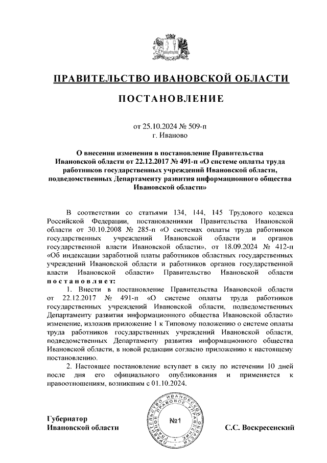 Постановление Правительства Ивановской области от 25.10.2024 N 509-п "О внесении изменения в постановление Правительства Ивановской области от 22.12.2017 N 491-п "О системе оплаты труда работников государственных учреждений Ивановской области, подведомственных Департаменту развития информационного общества Ивановской области"