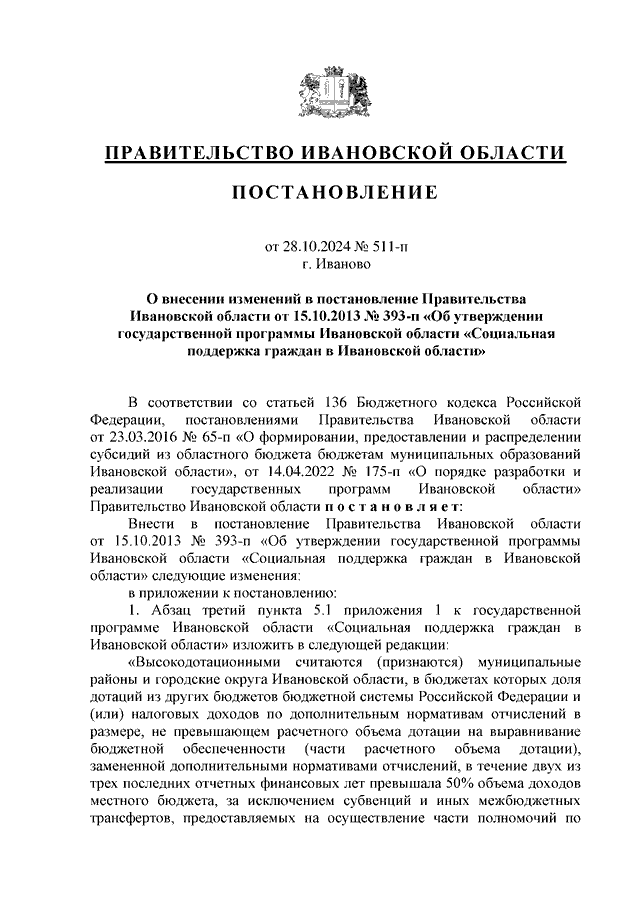 Постановление Правительства Ивановской области от 28.10.2024 N 511-п "О внесении изменений в постановление Правительства Ивановской области от 15.10.2013 N 393-п "Об утверждении государственной программы Ивановской области "Социальная поддержка граждан в Ивановской области" (вместе с "Перечнем объектов капитального строительства, мероприятий (укрупненных инвестиционных проектов), объектов недвижимости, реализуемых в рамках государственной программы Ивановской области "Социальная поддержка граждан в Ивановской области")