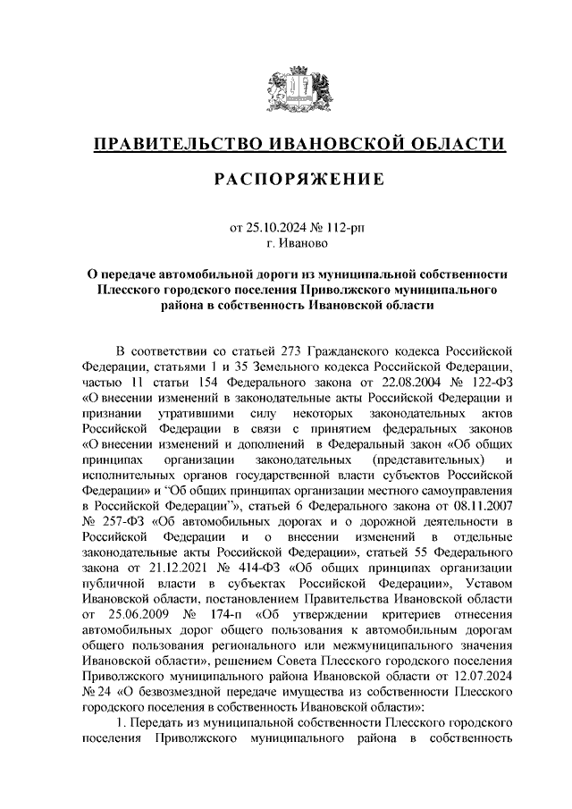 Распоряжение Правительства Ивановской области от 25.10.2024 N 112-рп "О передаче автомобильной дороги из муниципальной собственности Плесского городского поселения Приволжского муниципального района в собственность Ивановской области"