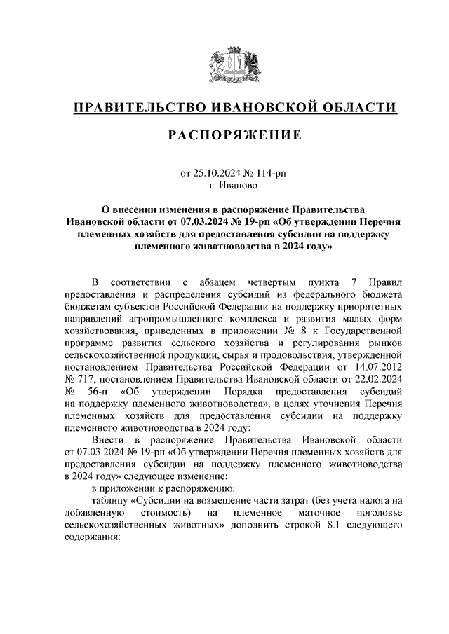 Распоряжение Правительства Ивановской области от 25.10.2024 N 114-рп "О внесении изменения в распоряжение Правительства Ивановской области от 07.03.2024 N 19-рп "Об утверждении Перечня племенных хозяйств для предоставления субсидии на поддержку племенного животноводства в 2024 году"