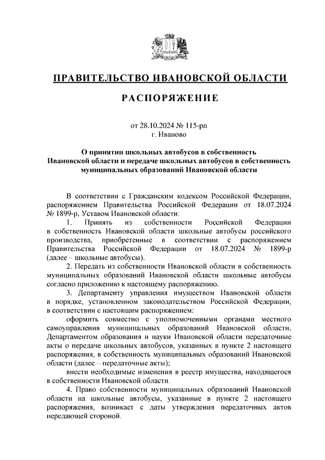 Распоряжение Правительства Ивановской области от 28.10.2024 N 115-рп "О принятии школьных автобусов в собственность Ивановской области и передаче школьных автобусов в собственность муниципальных образований Ивановской области"