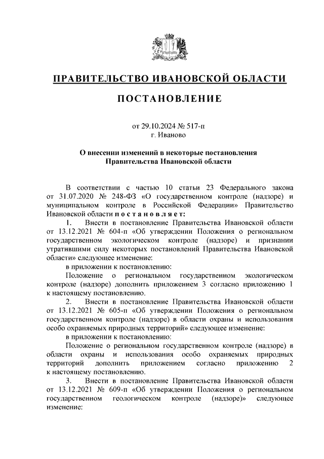 Постановление Правительства Ивановской области от 29.10.2024 N 517-п "О внесении изменений в некоторые постановления Правительства Ивановской области" (вместе с "Перечнем индикаторов риска нарушения обязательных требований при осуществлении регионального государственного экологического контроля (надзора) на территории Ивановской области", "Перечнем индикаторов риска нарушения обязательных требований при осуществлении регионального государственного геологического контроля (надзора) на территории Ивановской области")
