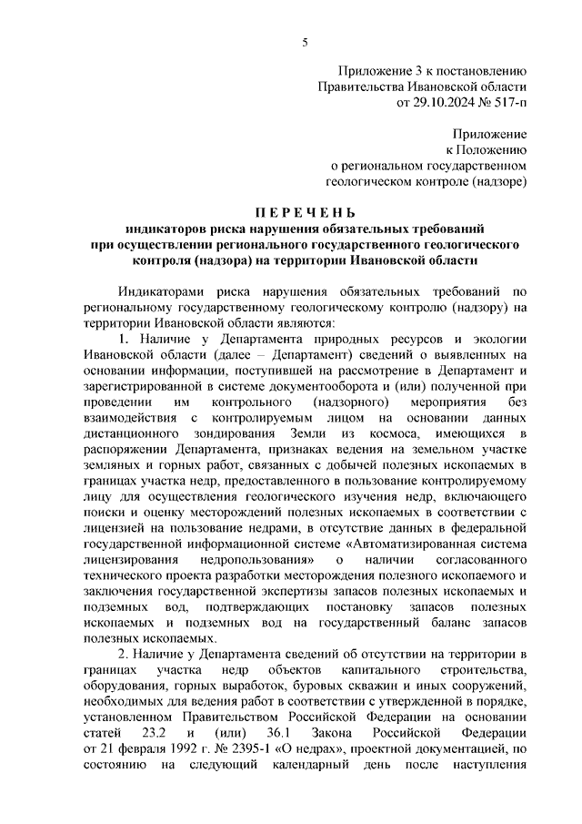 Постановление Правительства Ивановской области от 29.10.2024 N 517-п "О внесении изменений в некоторые постановления Правительства Ивановской области" (вместе с "Перечнем индикаторов риска нарушения обязательных требований при осуществлении регионального государственного экологического контроля (надзора) на территории Ивановской области", "Перечнем индикаторов риска нарушения обязательных требований при осуществлении регионального государственного геологического контроля (надзора) на территории Ивановской области")