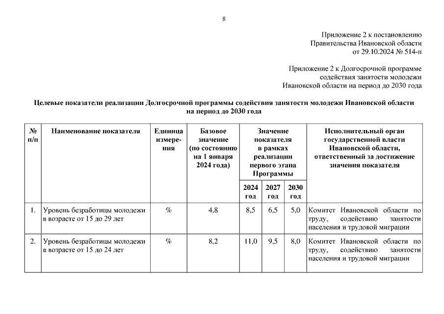 Постановление Правительства Ивановской области от 29.10.2024 N 514-п "О внесении изменений в постановление Правительства Ивановской области от 29.12.2022 N 814-п "Об утверждении Долгосрочной программы содействия занятости молодежи Ивановской области на период до 2030 года" (вместе с "Планом мероприятий по реализации Долгосрочной программы содействия занятости молодежи Ивановской области на период до 2030 года")