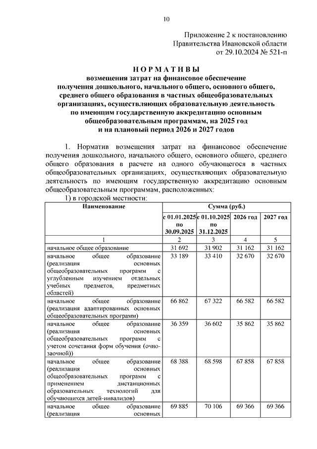 Постановление Правительства Ивановской области от 29.10.2024 N 521-п "Об утверждении нормативов обеспечения государственных гарантий реализации прав на получение общедоступного и бесплатного общего образования, обеспечения дополнительного образования в муниципальных образовательных организациях и возмещения затрат на финансовое обеспечение получения общего образования в частных образовательных организациях на 2025 год и на плановый период 2026 и 2027 годов" (вместе с "Нормативами обеспечения государственных гарантий реализации прав на получение общедоступного и бесплатного дошкольного, начального общего, основного общего, среднего общего образования в муниципальных общеобразовательных организациях, обеспечения дополнительного образования в муниципальных общеобразовательных организациях на 2025 год и на плановый период 2026 и 2027 годов", "Нормативами возмещения затрат на финансовое обеспечение получения дошкольного, начального общего, основного общего, среднего общего образования в частных общеобразовательных организациях, осуществляющих образовательную деятельность по имеющим государственную аккредитацию основным общеобразовательным программам, на 2025 год и на плановый период 2026 и 2027 годов", "Нормативами обеспечения государственных гарантий реализации прав на получение общедоступного и бесплатного дошкольного образования в муниципальных дошкольных образовательных организациях на 2025 год и на плановый период 2026 и 2027 годов", "Нормативами возмещения затрат на финансовое обеспечение получения дошкольного образования в частных дошкольных образовательных организациях на 2025 год и на плановый период 2026 и 2027 годов", "Перечнем малокомплектных муниципальных общеобразовательных организаций, для которых применяется норматив финансового обеспечения, учитывающий затраты, не зависящие от количества обучающихся, для расчета субвенций местным бюджетам в размере, необходимом для реализации основных общеобразовательных программ в части финансирования расходов на оплату труда работников общеобразовательных организаций, расходов на учебники, учебные пособия, средства обучения, игры, игрушки (за исключением расходов на содержание зданий и оплату коммунальных услуг, осуществляемых из местных бюджетов)")