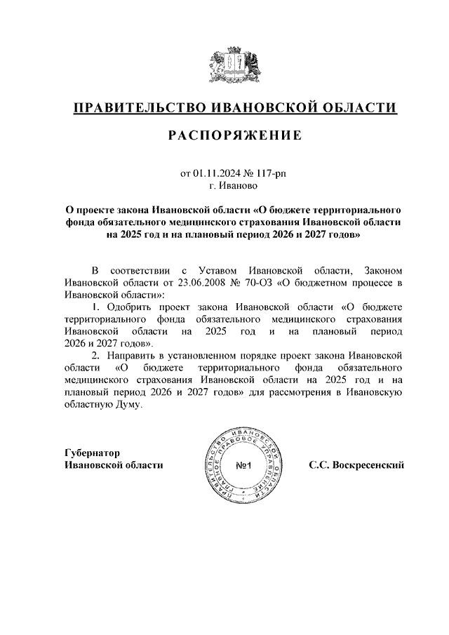Распоряжение Правительства Ивановской области от 01.11.2024 N 117-рп "О проекте закона Ивановской области "О бюджете территориального фонда обязательного медицинского страхования Ивановской области на 2025 год и на плановый период 2026 и 2027 годов"