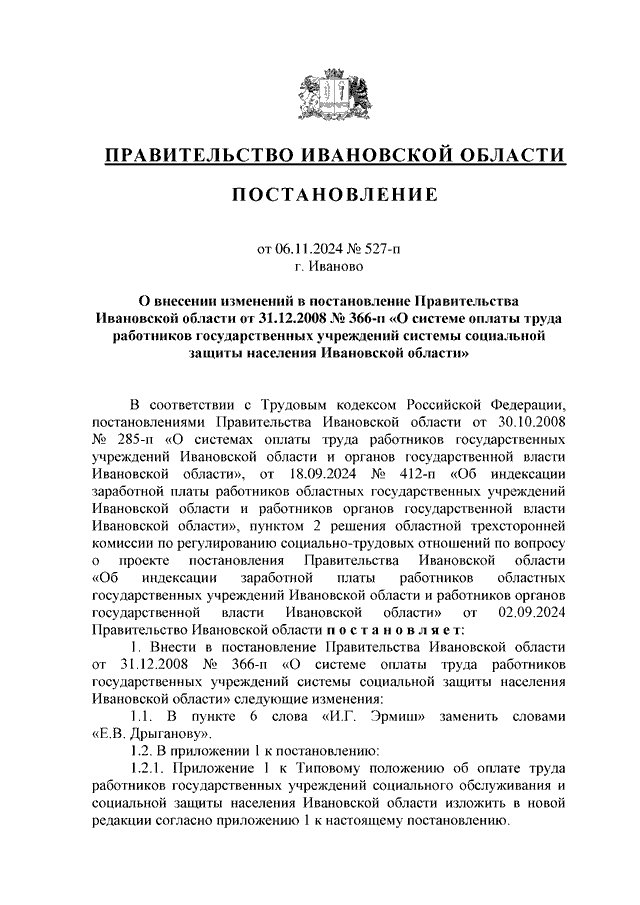 Постановление Правительства Ивановской области от 06.11.2024 N 527-п "О внесении изменений в постановление Правительства Ивановской области от 31.12.2008 N 366-п "О системе оплаты труда работников государственных учреждений системы социальной защиты населения Ивановской области" (вместе с "Перечнем профессиональных квалификационных групп должностей работников государственных учреждений системы социальной защиты населения Ивановской области", "Перечнем профессиональных квалификационных групп должностей работников государственных образовательных учреждений для детей-сирот и детей, оставшихся без попечения родителей, Ивановской области")