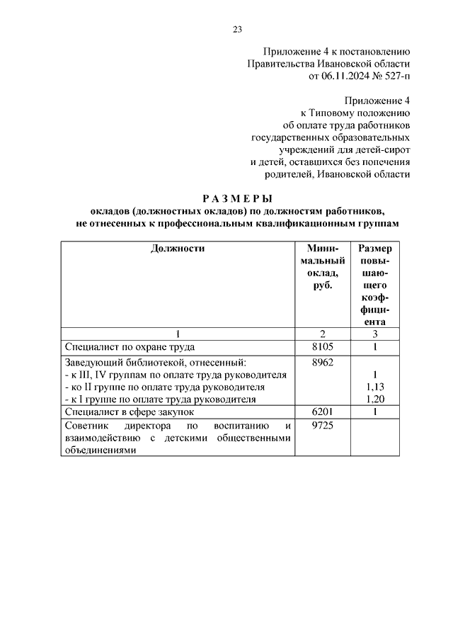 Постановление Правительства Ивановской области от 06.11.2024 N 527-п "О внесении изменений в постановление Правительства Ивановской области от 31.12.2008 N 366-п "О системе оплаты труда работников государственных учреждений системы социальной защиты населения Ивановской области" (вместе с "Перечнем профессиональных квалификационных групп должностей работников государственных учреждений системы социальной защиты населения Ивановской области", "Перечнем профессиональных квалификационных групп должностей работников государственных образовательных учреждений для детей-сирот и детей, оставшихся без попечения родителей, Ивановской области")