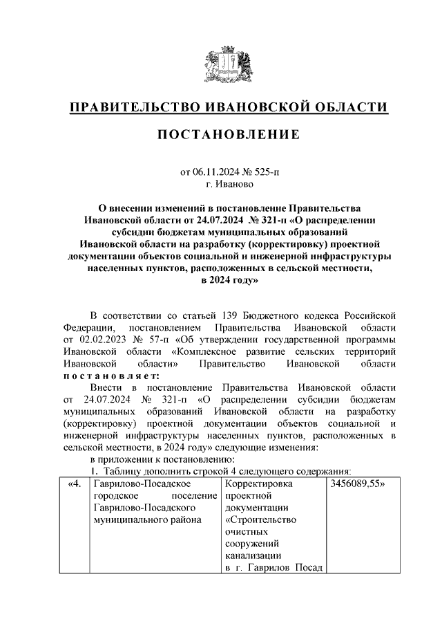 Постановление Правительства Ивановской области от 06.11.2024 N 525-п "О внесении изменений в постановление Правительства Ивановской области от 24.07.2024 N 321-п "О распределении субсидии бюджетам муниципальных образований Ивановской области на разработку (корректировку) проектной документации объектов социальной и инженерной инфраструктуры населенных пунктов, расположенных в сельской местности, в 2024 году"