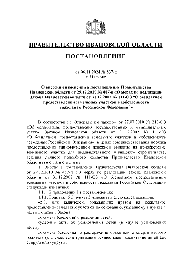 Постановление Правительства Ивановской области от 06.11.2024 N 537-п "О внесении изменений в постановление Правительства Ивановской области от 29.12.2010 N 487-п "О мерах по реализации Закона Ивановской области от 31.12.2002 N 111-ОЗ "О бесплатном предоставлении земельных участков в собственность гражданам Российской Федерации"