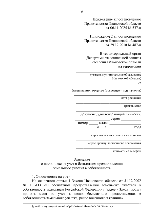 Постановление Правительства Ивановской области от 06.11.2024 N 537-п "О внесении изменений в постановление Правительства Ивановской области от 29.12.2010 N 487-п "О мерах по реализации Закона Ивановской области от 31.12.2002 N 111-ОЗ "О бесплатном предоставлении земельных участков в собственность гражданам Российской Федерации"