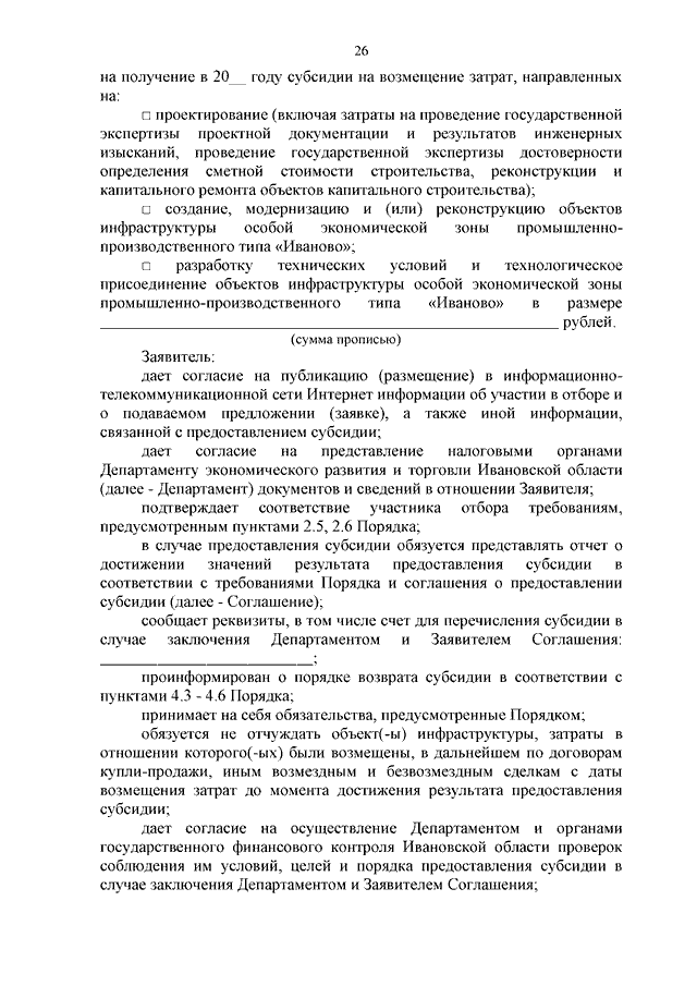 Постановление Правительства Ивановской области от 06.11.2024 N 535-п "О внесении изменений в постановление Правительства Ивановской области от 15.11.2023 N 568-п "Об утверждении Порядка предоставления субсидии из областного бюджета юридическим лицам в целях возмещения затрат на проектирование (включая затраты на проведение государственной экспертизы проектной документации и результатов инженерных изысканий, проведение государственной экспертизы определения сметной стоимости строительства, реконструкции и капитального ремонта объектов капитального строительства), капитальных затрат на создание, модернизацию и (или) реконструкцию объектов инфраструктуры особой экономической зоны промышленно-производственного типа "Иваново", разработку технических условий и технологическое присоединение объектов инфраструктуры особой экономической зоны промышленно-производственного типа "Иваново"
