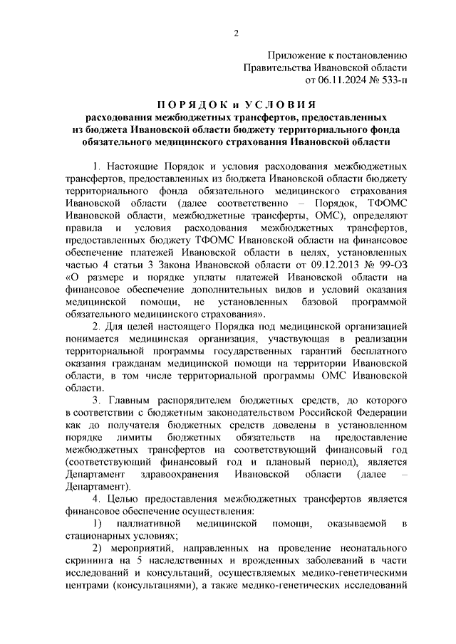 Постановление Правительства Ивановской области от 06.11.2024 N 533-п "Об утверждении Порядка и условий расходования межбюджетных трансфертов, предоставленных из бюджета Ивановской области бюджету территориального фонда обязательного медицинского страхования Ивановской области"