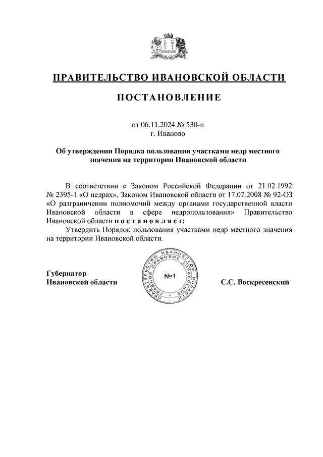 Постановление Правительства Ивановской области от 06.11.2024 N 530-п "Об утверждении Порядка пользования участками недр местного значения на территории Ивановской области"