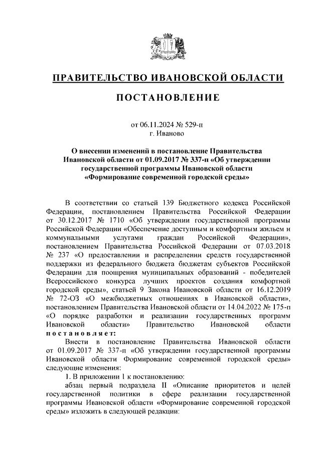 Постановление Правительства Ивановской области от 06.11.2024 N 529-п "О внесении изменений в постановление Правительства Ивановской области от 01.09.2017 N 337-п "Об утверждении государственной программы Ивановской области "Формирование современной городской среды"
