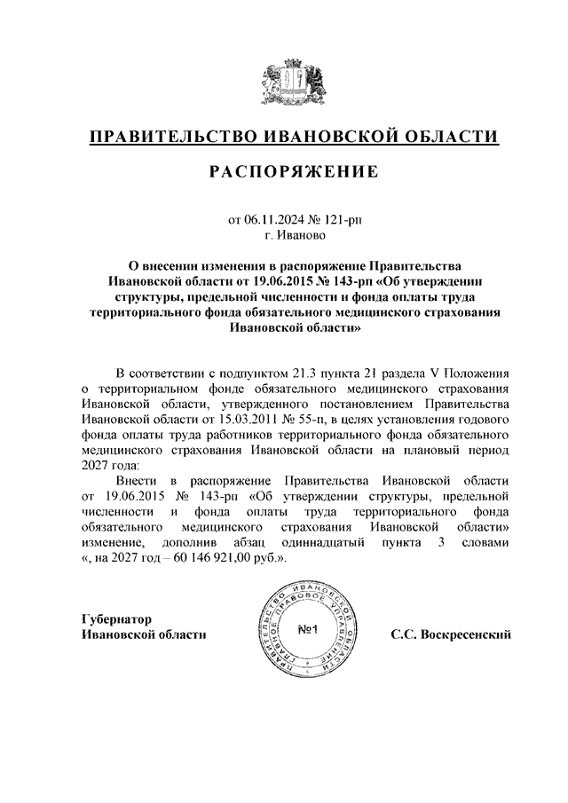 Распоряжение Правительства Ивановской области от 06.11.2024 N 121-рп "О внесении изменения в распоряжение Правительства Ивановской области от 19.06.2015 N 143-рп "Об утверждении структуры, предельной численности и фонда оплаты труда территориального фонда обязательного медицинского страхования Ивановской области"
