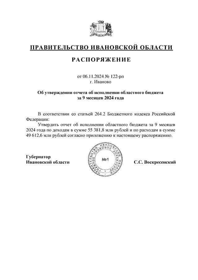 Распоряжение Правительства Ивановской области от 06.11.2024 N 122-рп "Об утверждении отчета об исполнении областного бюджета за 9 месяцев 2024 года"