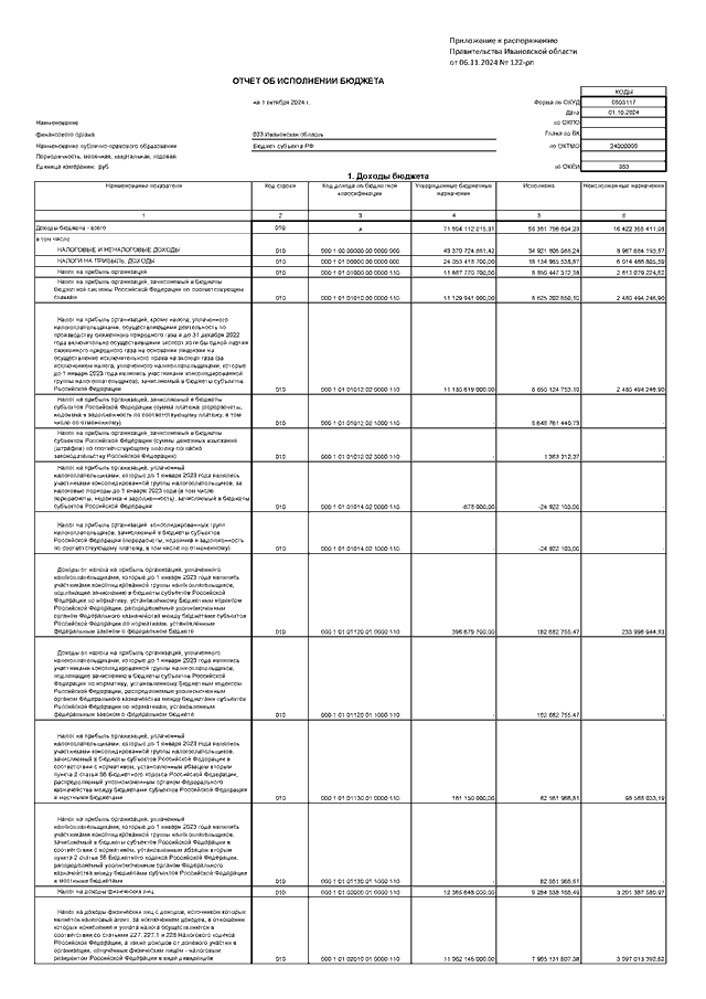 Распоряжение Правительства Ивановской области от 06.11.2024 N 122-рп "Об утверждении отчета об исполнении областного бюджета за 9 месяцев 2024 года"