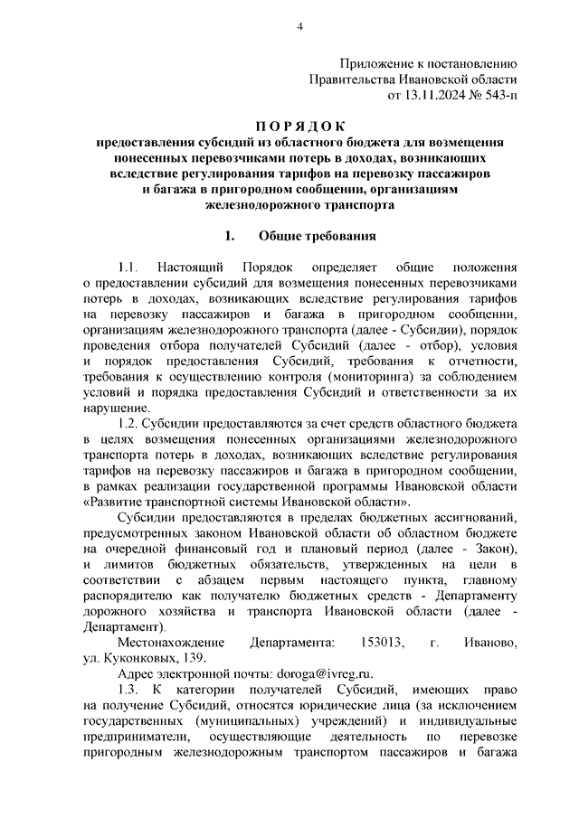 Постановление Правительства Ивановской области от 13.11.2024 N 543-п "Об утверждении Порядка предоставления субсидий из областного бюджета для возмещения понесенных перевозчиками потерь в доходах, возникающих вследствие регулирования тарифов на перевозку пассажиров и багажа в пригородном сообщении, организациям железнодорожного транспорта"