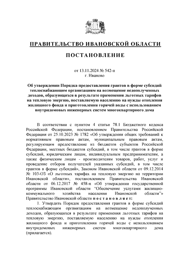 Постановление Правительства Ивановской области от 13.11.2024 N 542-п "Об утверждении Порядка предоставления грантов в форме субсидий теплоснабжающим организациям на возмещение недополученных доходов, образующихся в результате применения льготных тарифов на тепловую энергию, поставляемую населению на нужды отопления жилищного фонда и приготовления горячей воды с использованием внутридомовых инженерных систем многоквартирного дома"