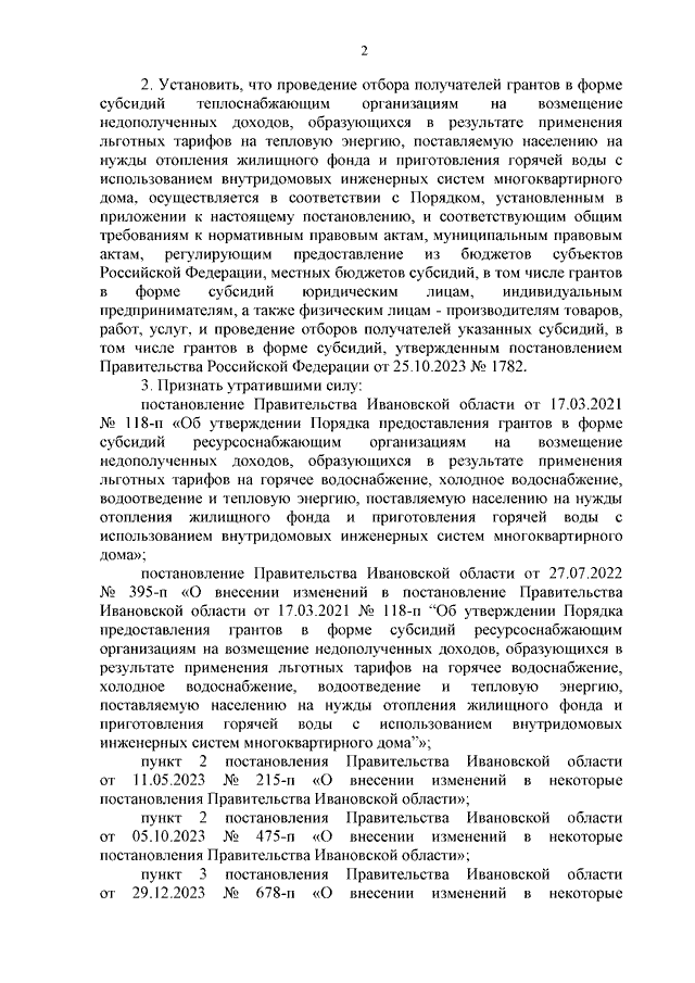 Постановление Правительства Ивановской области от 13.11.2024 N 542-п "Об утверждении Порядка предоставления грантов в форме субсидий теплоснабжающим организациям на возмещение недополученных доходов, образующихся в результате применения льготных тарифов на тепловую энергию, поставляемую населению на нужды отопления жилищного фонда и приготовления горячей воды с использованием внутридомовых инженерных систем многоквартирного дома"