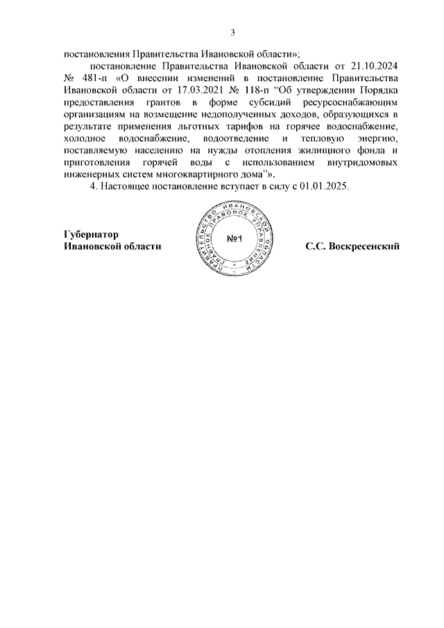 Постановление Правительства Ивановской области от 13.11.2024 N 542-п "Об утверждении Порядка предоставления грантов в форме субсидий теплоснабжающим организациям на возмещение недополученных доходов, образующихся в результате применения льготных тарифов на тепловую энергию, поставляемую населению на нужды отопления жилищного фонда и приготовления горячей воды с использованием внутридомовых инженерных систем многоквартирного дома"