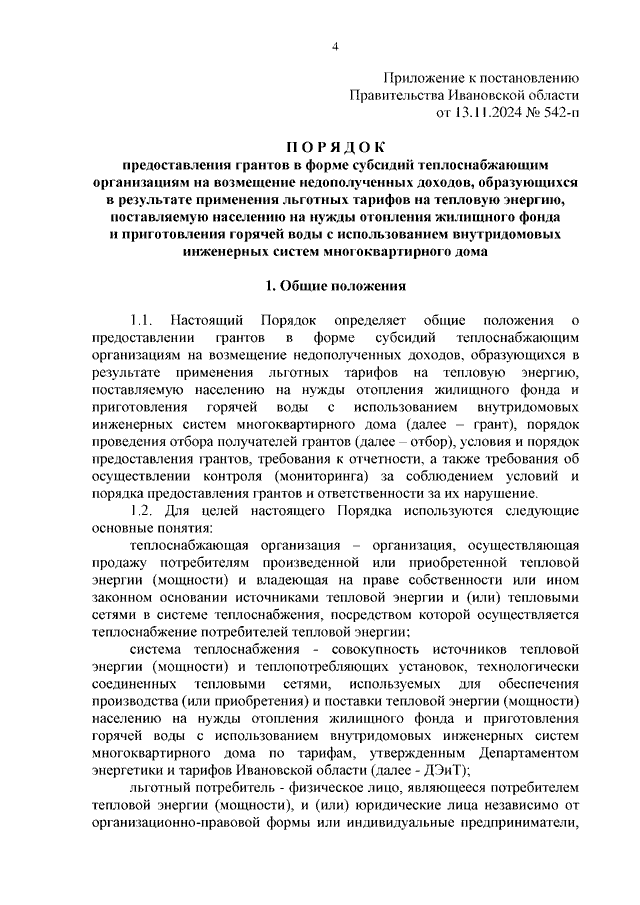 Постановление Правительства Ивановской области от 13.11.2024 N 542-п "Об утверждении Порядка предоставления грантов в форме субсидий теплоснабжающим организациям на возмещение недополученных доходов, образующихся в результате применения льготных тарифов на тепловую энергию, поставляемую населению на нужды отопления жилищного фонда и приготовления горячей воды с использованием внутридомовых инженерных систем многоквартирного дома"