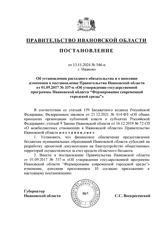 Постановление Правительства Ивановской области от 13.11.2024 N 546-п "Об установлении расходного обязательства и о внесении изменения в постановление Правительства Ивановской области от 01.09.2017 N 337-п "Об утверждении государственной программы Ивановской области "Формирование современной городской среды" (вместе с "Порядком предоставления и распределения субсидий бюджетам муниципальных образований Ивановской области на разработку проектной документации на благоустройство общественных территорий")