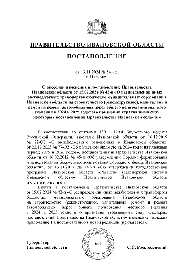 Постановление Правительства Ивановской области от 13.11.2024 N 541-п "О внесении изменения в постановление Правительства Ивановской области от 15.02.2024 N 42-п "О распределении иных межбюджетных трансфертов бюджетам муниципальных образований Ивановской области на строительство (реконструкцию), капитальный ремонт и ремонт автомобильных дорог общего пользования местного значения в 2024 и 2025 годах и о признании утратившими силу некоторых постановлений Правительства Ивановской области"