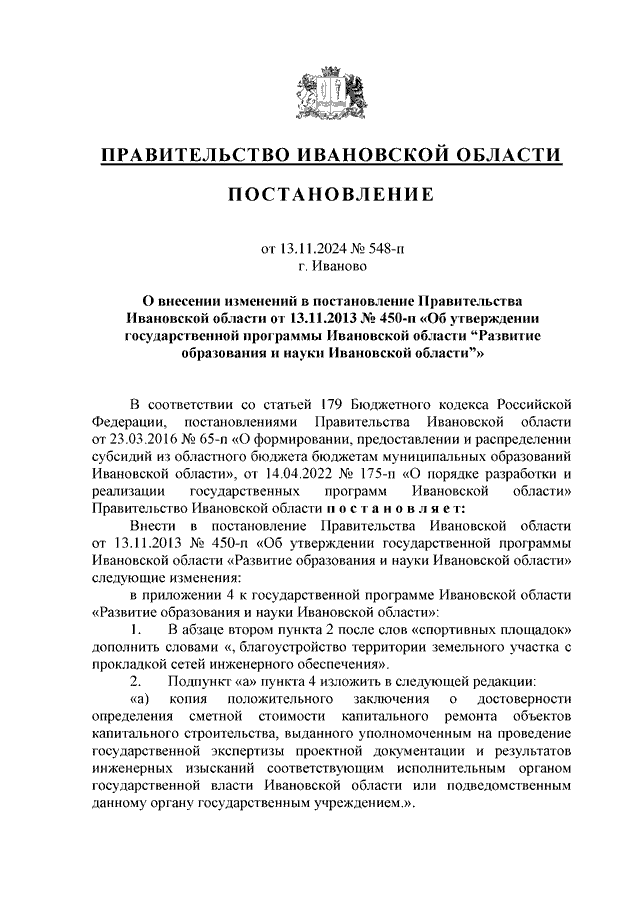 Постановление Правительства Ивановской области от 13.11.2024 N 548-п "О внесении изменений в постановление Правительства Ивановской области от 13.11.2013 N 450-п "Об утверждении государственной программы Ивановской области "Развитие образования и науки Ивановской области"