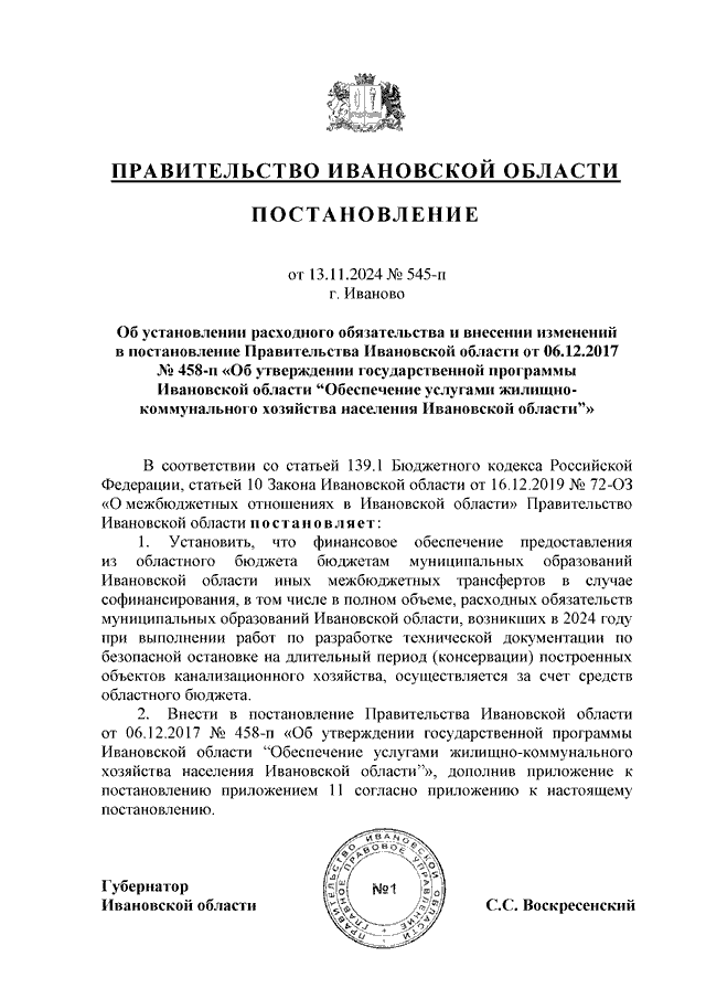 Постановление Правительства Ивановской области от 13.11.2024 N 545-п "Об установлении расходного обязательства и внесении изменений в постановление Правительства Ивановской области от 06.12.2017 N 458-п "Об утверждении государственной программы Ивановской области "Обеспечение услугами жилищно-коммунального хозяйства населения Ивановской области" (вместе с "Методикой распределения и правилами предоставления из областного бюджета бюджетам муниципальных образований Ивановской области иных межбюджетных трансфертов в случае софинансирования, в том числе в полном объеме, расходных обязательств муниципальных образований Ивановской области, возникших в 2024 году при выполнении работ по разработке технической документации по безопасной остановке на длительный период (консервации) построенных объектов канализационного хозяйства")