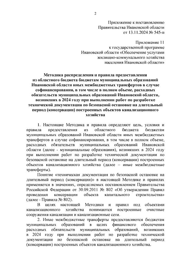 Постановление Правительства Ивановской области от 13.11.2024 N 545-п "Об установлении расходного обязательства и внесении изменений в постановление Правительства Ивановской области от 06.12.2017 N 458-п "Об утверждении государственной программы Ивановской области "Обеспечение услугами жилищно-коммунального хозяйства населения Ивановской области" (вместе с "Методикой распределения и правилами предоставления из областного бюджета бюджетам муниципальных образований Ивановской области иных межбюджетных трансфертов в случае софинансирования, в том числе в полном объеме, расходных обязательств муниципальных образований Ивановской области, возникших в 2024 году при выполнении работ по разработке технической документации по безопасной остановке на длительный период (консервации) построенных объектов канализационного хозяйства")