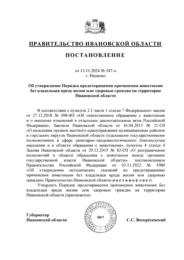 Постановление Правительства Ивановской области от 13.11.2024 N 547-п "Об утверждении Порядка предотвращения причинения животными без владельцев вреда жизни или здоровью граждан на территории Ивановской области"