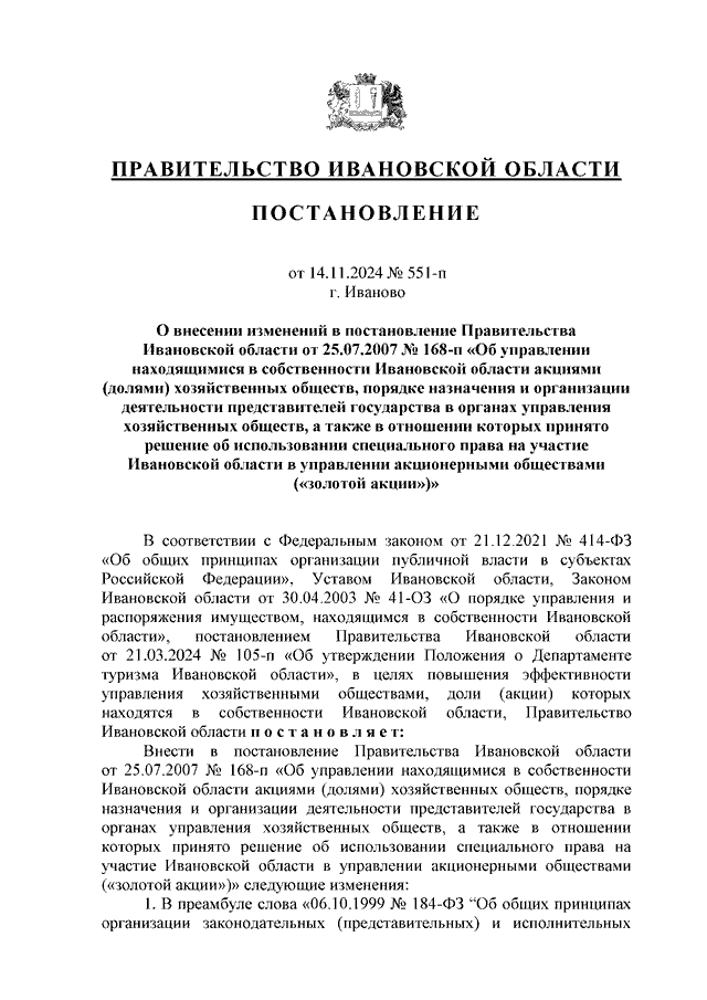 Постановление Правительства Ивановской области от 14.11.2024 N 551-п "О внесении изменений в постановление Правительства Ивановской области от 25.07.2007 N 168-п "Об управлении находящимися в собственности Ивановской области акциями (долями) хозяйственных обществ, порядке назначения и организации деятельности представителей государства в органах управления хозяйственных обществ, а также в отношении которых принято решение об использовании специального права на участие Ивановской области в управлении акционерными обществами ("золотой акции")"