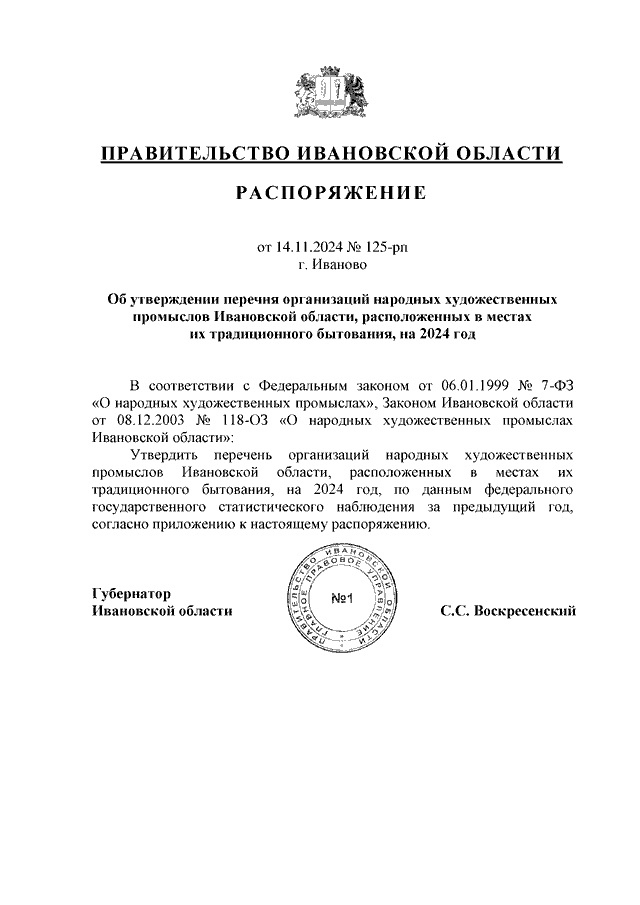 Распоряжение Правительства Ивановской области от 14.11.2024 N 125-рп "Об утверждении перечня организаций народных художественных промыслов Ивановской области, расположенных в местах их традиционного бытования, на 2024 год"