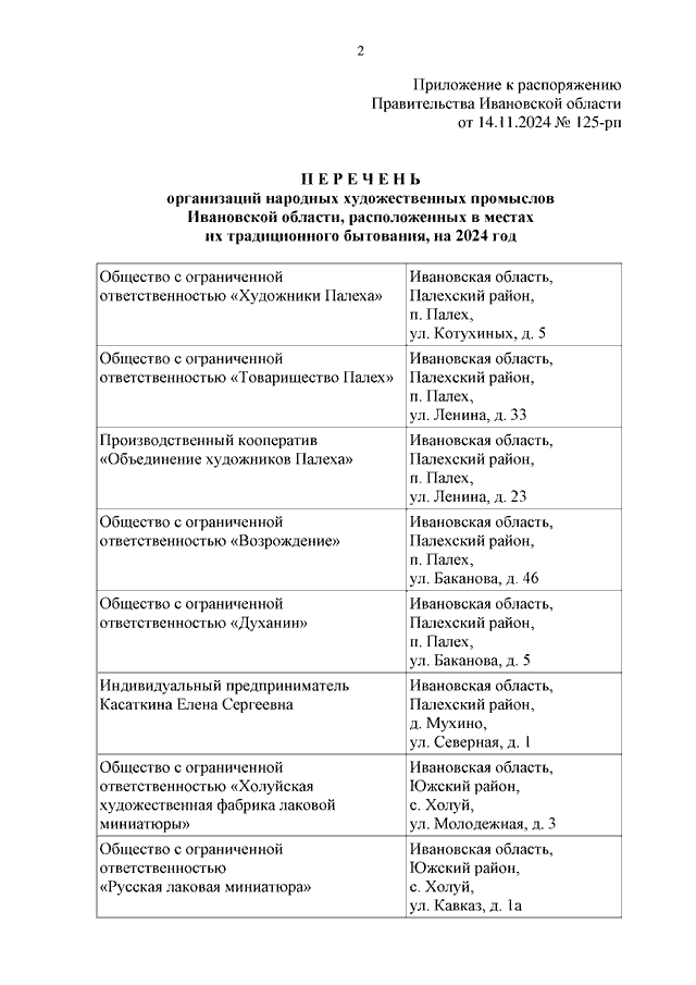 Распоряжение Правительства Ивановской области от 14.11.2024 N 125-рп "Об утверждении перечня организаций народных художественных промыслов Ивановской области, расположенных в местах их традиционного бытования, на 2024 год"